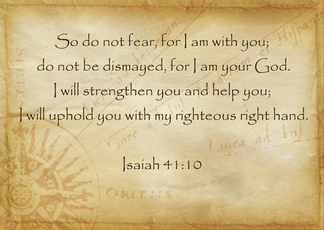 "So do not fear, for I am with you; do not be dismayed, for I am your God. I will strengthen you and help you; I will uphold you with my righteous right hand. Isaiah 41:10"