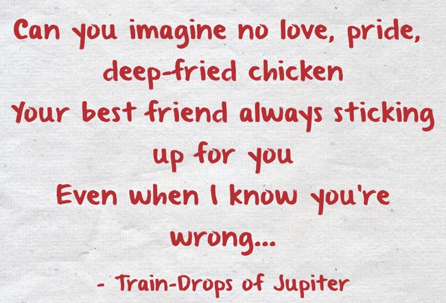 "Can you imagine no love, pride, deep-fried chicken Your best friend always sticking up for you Even when I know you're wrong..."