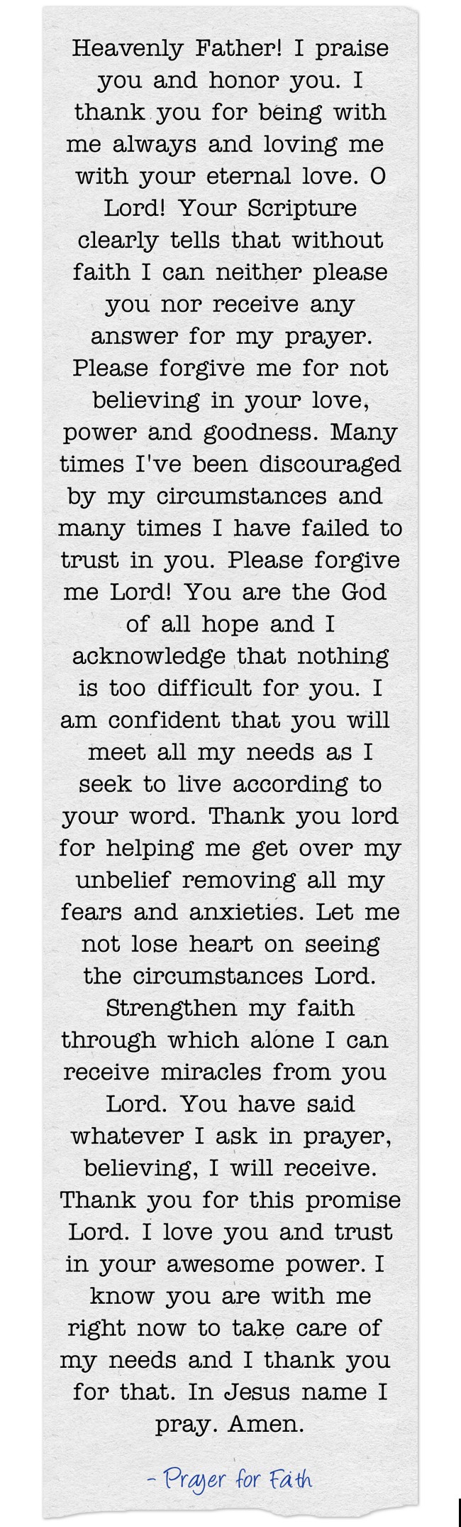 "Heavenly Father! I praise you and honor you. I thank you for being with me always and loving me with your eternal love. O Lord! Your Scripture clearly tells that without faith I can neither please you nor receive any answer for my prayer. Please forgive me for not believing in your love, power and goodness. Many times I've been discouraged by my circumstances and many times I have failed to trust in you. Please forgive me Lord! You are the God of all hope and I acknowledge that nothing is too difficult for you. I am confident that you will meet all my needs as I seek to live according to your word. Thank you lord for helping me get over my unbelief removing all my fears and anxieties. Let me not lose heart on seeing the circumstances Lord. Strengthen my faith through which alone I can receive miracles from you Lord. You have said whatever I ask in prayer, believing, I will receive. Thank you for this promise Lord. I love you and trust in your awesome power. I know you are with me right now to take care of my needs and I thank you for that. In Jesus name I pray. Amen."