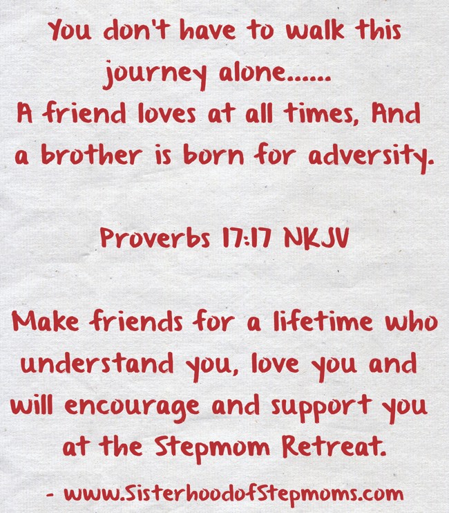 "You don't have to walk this journey alone...... A friend loves at all times, And a brother is born for adversity. Proverbs 17:17 NKJV Make friends for a lifetime who understand you, love you and will encourage and support you at the Stepmom Retreat."