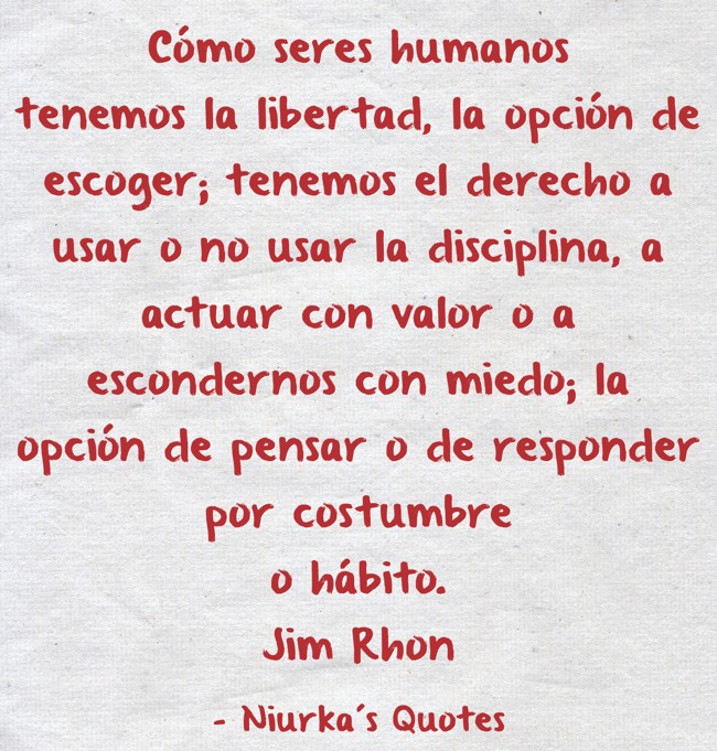 "Cómo seres humanos tenemos la libertad, la opción de escoger; tenemos el derecho a usar o no usar la disciplina, a actuar con valor o a escondernos con miedo; la opción de pensar o de responder por costumbre o hábito. Jim Rhon"