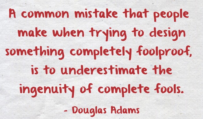 " A common mistake that people make when trying to design something completely foolproof, is to underestimate the ingenuity of complete fools. "