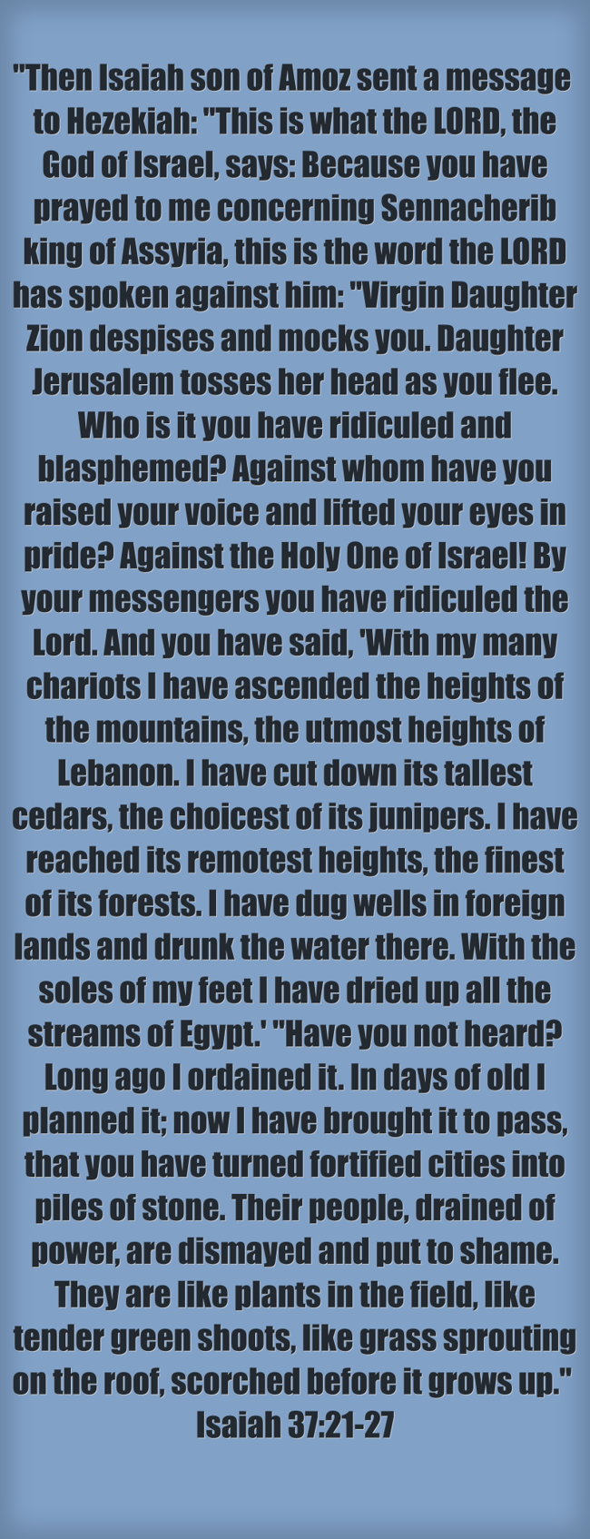 ""Then Isaiah son of Amoz sent a message to Hezekiah: "This is what the LORD, the God of Israel, says: Because you have prayed to me concerning Sennacherib king of Assyria, this is the word the LORD has spoken against him: "Virgin Daughter Zion despises and mocks you. Daughter Jerusalem tosses her head as you flee. Who is it you have ridiculed and blasphemed? Against whom have you raised your voice and lifted your eyes in pride? Against the Holy One of Israel! By your messengers you have ridiculed the Lord. And you have said, 'With my many chariots I have ascended the heights of the mountains, the utmost heights of Lebanon. I have cut down its tallest cedars, the choicest of its junipers. I have reached its remotest heights, the finest of its forests. I have dug wells in foreign lands and drunk the water there. With the soles of my feet I have dried up all the streams of Egypt.' "Have you not heard? Long ago I ordained it. In days of old I planned it; now I have brought it to pass, that you have turned fortified cities into piles of stone. Their people, drained of power, are dismayed and put to shame. They are like plants in the field, like tender green shoots, like grass sprouting on the roof, scorched before it grows up." Isaiah 37:21-27 "