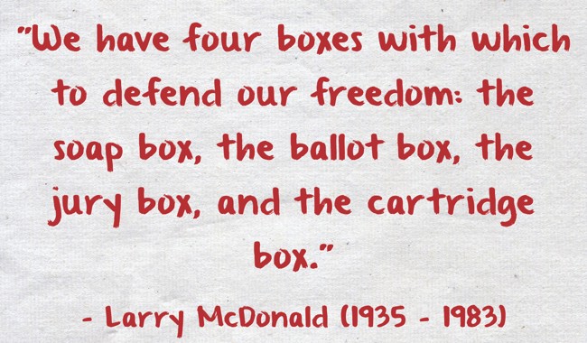 ""We have four boxes with which to defend our freedom: the soap box, the ballot box, the jury box, and the cartridge box.""