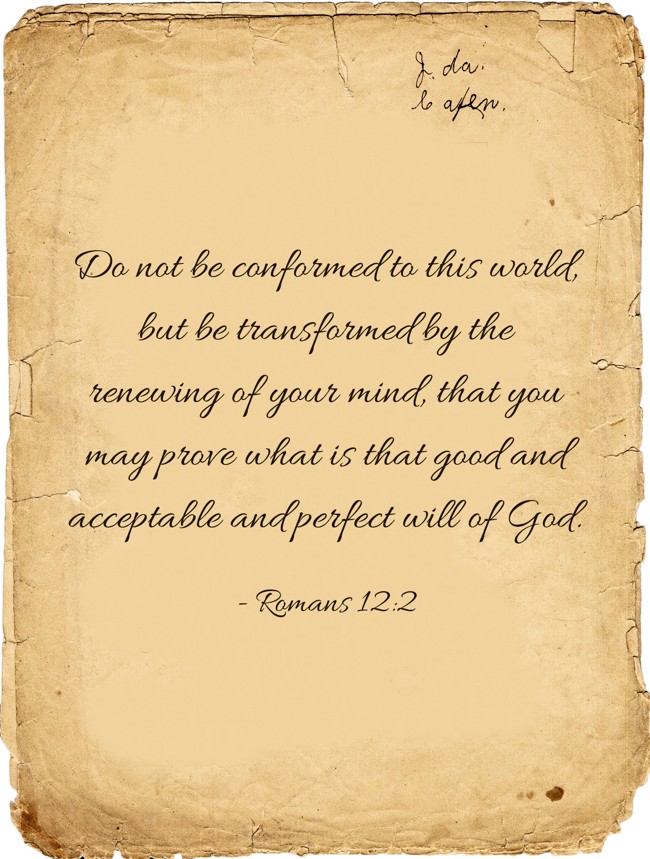 "Do not be conformed to this world, but be transformed by the renewing of your mind, that you may prove what is that good and acceptable and perfect will of God."