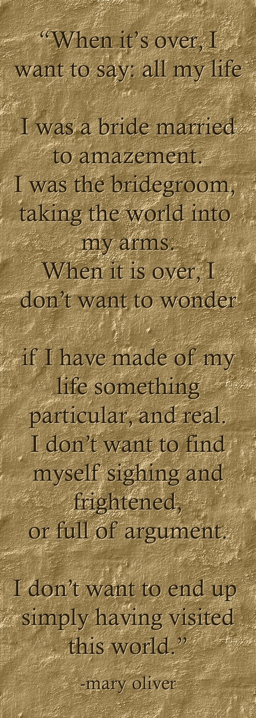 "“When it’s over, I want to say: all my life I was a bride married to amazement. I was the bridegroom, taking the world into my arms. When it is over, I don’t want to wonder if I have made of my life something particular, and real. I don’t want to find myself sighing and frightened, or full of argument. I don’t want to end up simply having visited this world.” "