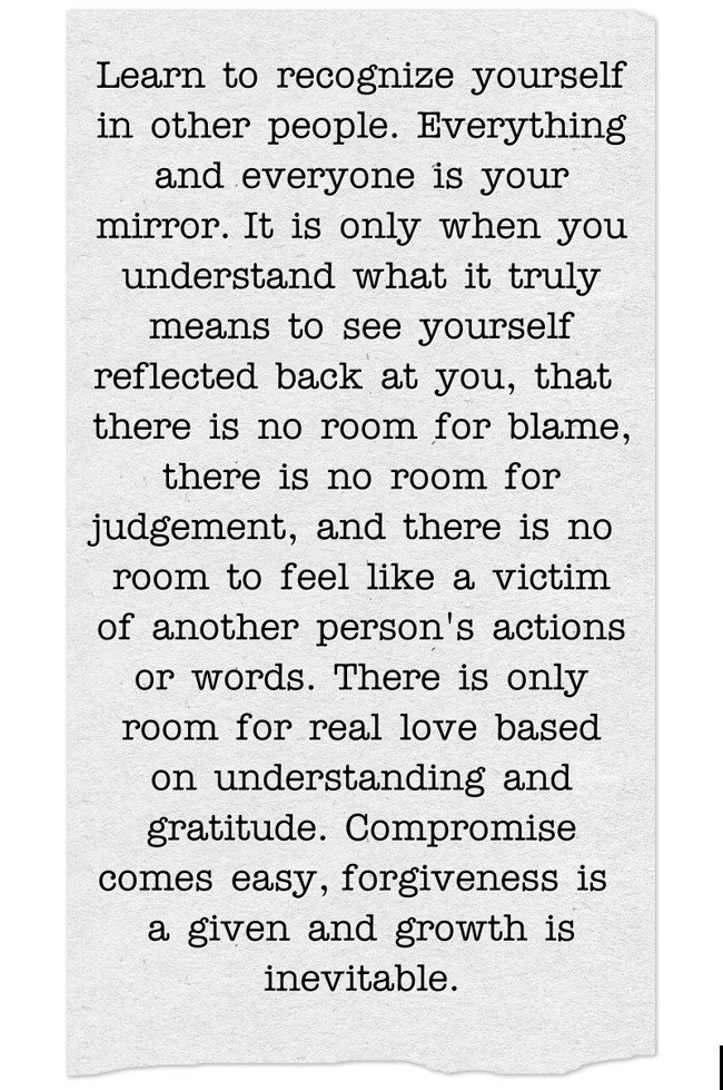 "Learn to recognize yourself in other people. Everything and everyone is your mirror. It is only when you understand what it truly means to see yourself reflected back at you, that there is no room for blame, there is no room for judgement, and there is no room to feel like a victim of another person's actions or words. There is only room for real love based on understanding and gratitude. Compromise comes easy, forgiveness is a given and growth is inevitable."