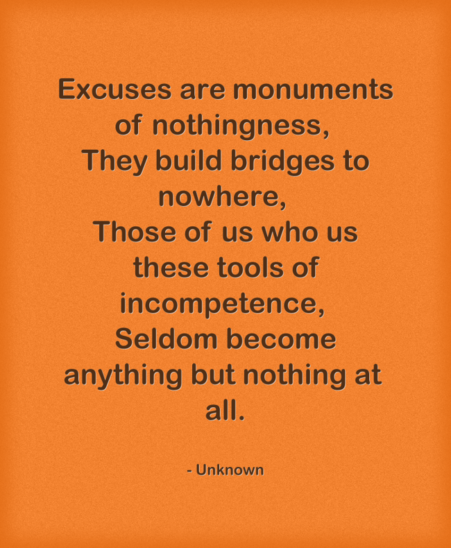 "Excuses are monuments of nothingness, They build bridges to nowhere, Those of us who us these tools of incompetence, Seldom become anything but nothing at all."