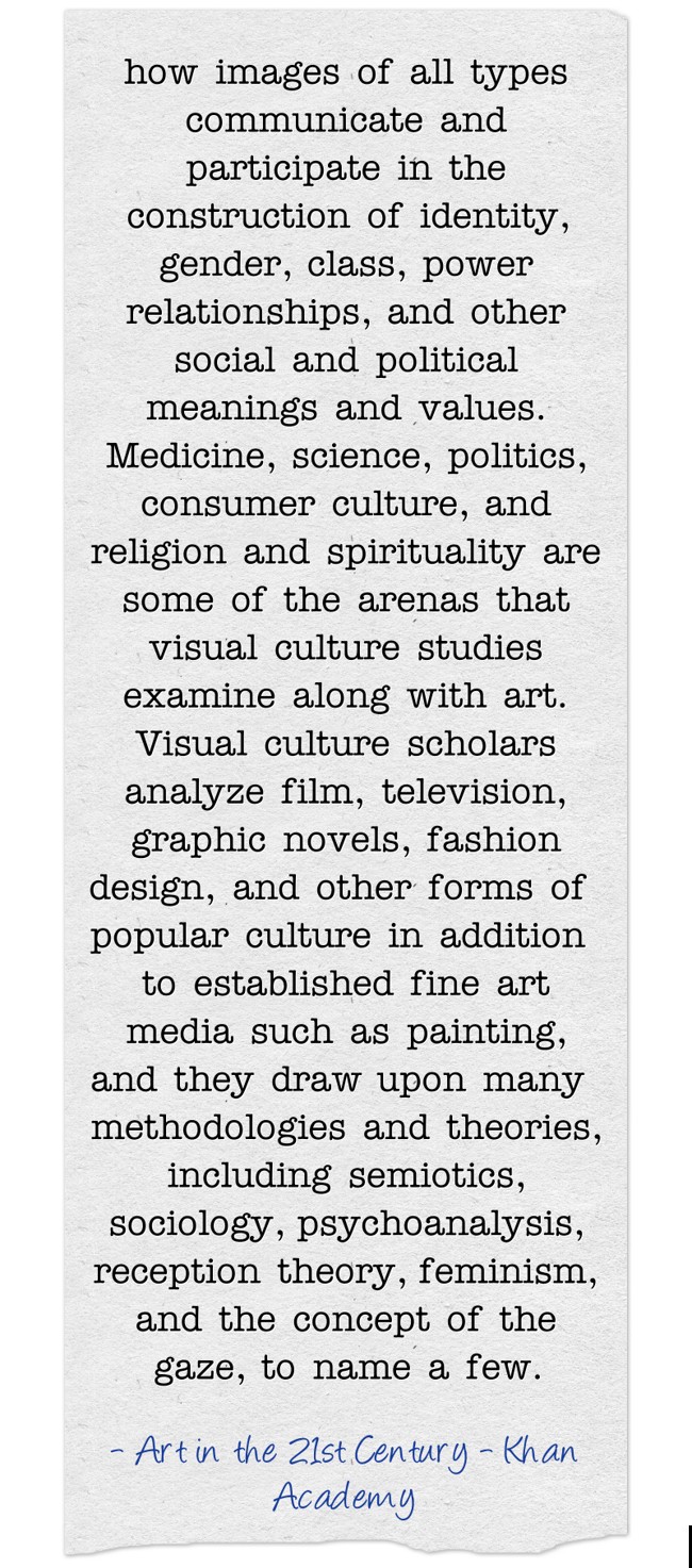 "how images of all types communicate and participate in the construction of identity, gender, class, power relationships, and other social and political meanings and values. Medicine, science, politics, consumer culture, and religion and spirituality are some of the arenas that visual culture studies examine along with art. Visual culture scholars analyze film, television, graphic novels, fashion design, and other forms of popular culture in addition to established fine art media such as painting, and they draw upon many methodologies and theories, including semiotics, sociology, psychoanalysis, reception theory, feminism, and the concept of the gaze, to name a few."