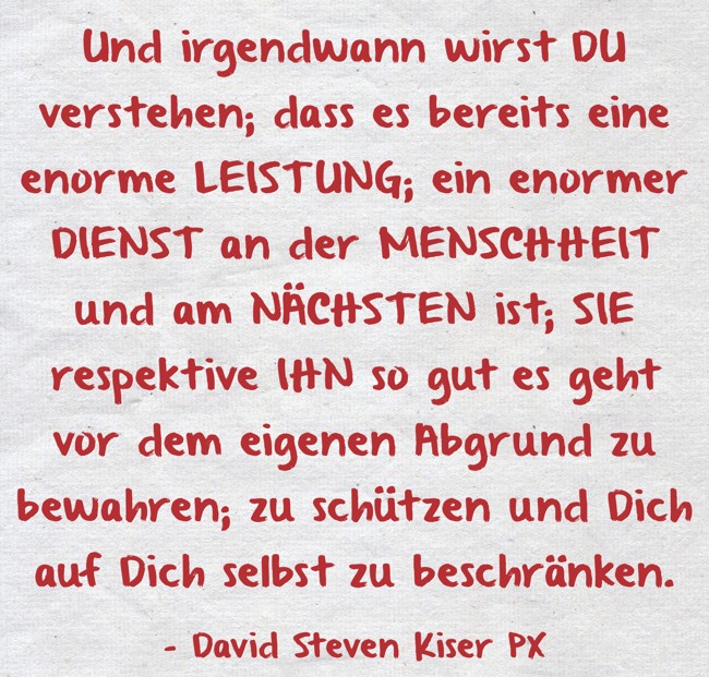 "Und irgendwann wirst DU verstehen; dass es bereits eine enorme LEISTUNG; ein enormer DIENST an der MENSCHHEIT und am NÄCHSTEN ist; SIE respektive IHN so gut es geht vor dem eigenen Abgrund zu bewahren; zu schützen und Dich auf Dich selbst zu beschränken."