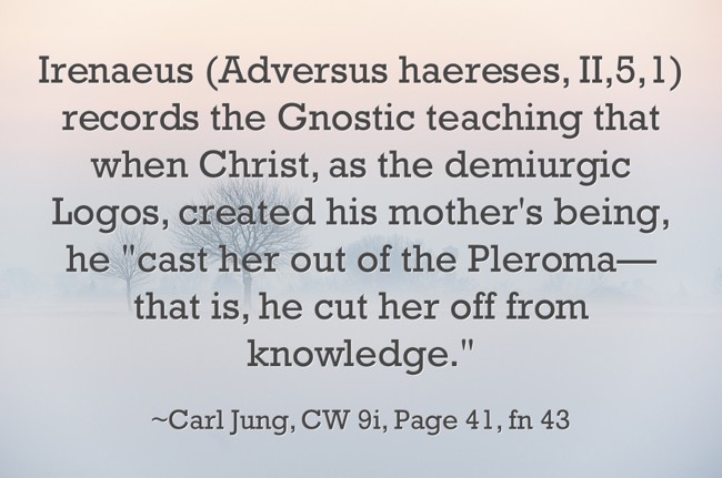 "Irenaeus (Adversus haereses, II,5,1) records the Gnostic teaching that when Christ, as the demiurgic Logos, created his mother's being, he "cast her out of the Pleroma—that is, he cut her off from knowledge.""