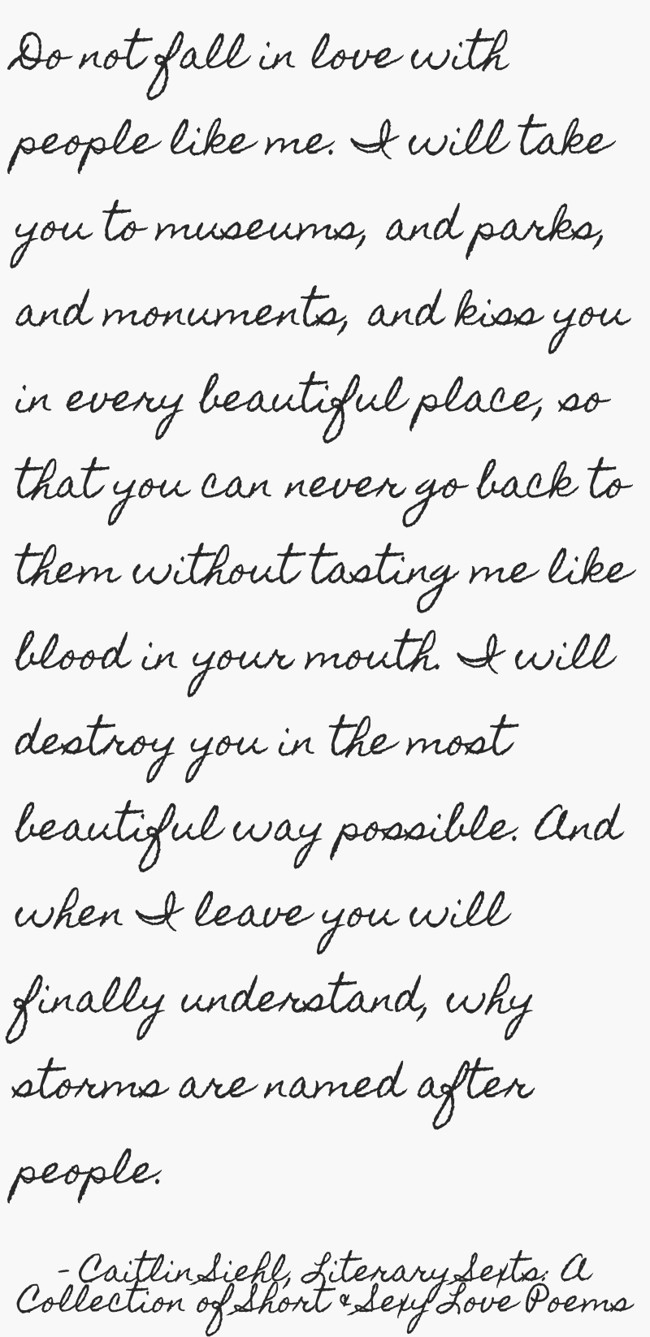 "Do not fall in love with people like me. I will take you to museums, and parks, and monuments, and kiss you in every beautiful place, so that you can never go back to them without tasting me like blood in your mouth. I will destroy you in the most beautiful way possible. And when I leave you will finally understand, why storms are named after people."
