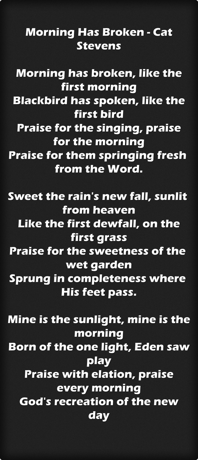 " Morning Has Broken - Cat Stevens Morning has broken, like the first morning Blackbird has spoken, like the first bird Praise for the singing, praise for the morning Praise for them springing fresh from the Word. Sweet the rain's new fall, sunlit from heaven Like the first dewfall, on the first grass Praise for the sweetness of the wet garden Sprung in completeness where His feet pass. Mine is the sunlight, mine is the morning Born of the one light, Eden saw play Praise with elation, praise every morning God's recreation of the new day"