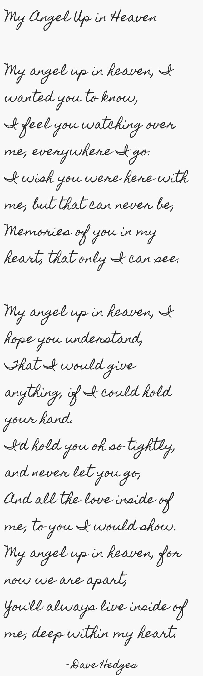 "My Angel Up in Heaven My angel up in heaven, I wanted you to know, I feel you watching over me, everywhere I go. I wish you were here with me, but that can never be, Memories of you in my heart, that only I can see. My angel up in heaven, I hope you understand, That I would give anything, if I could hold your hand. I'd hold you oh so tightly, and never let you go, And all the love inside of me, to you I would show. My angel up in heaven, for now we are apart, You'll always live inside of me, deep within my heart. "