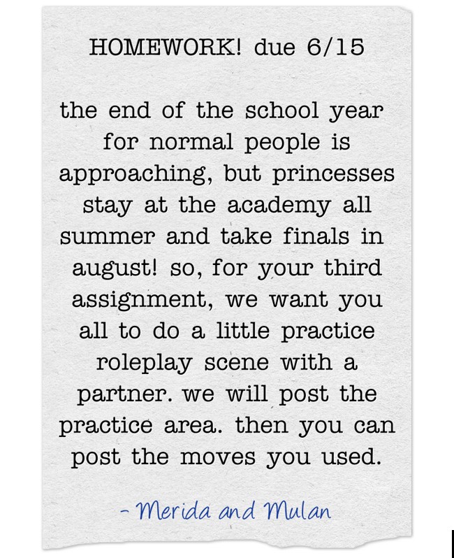 "HOMEWORK! due 6/15 the end of the school year for normal people is approaching, but princesses stay at the academy all summer and take finals in august! so, for your third assignment, we want you all to do a little practice roleplay scene with a partner. we will post the practice area. then you can post the moves you used."