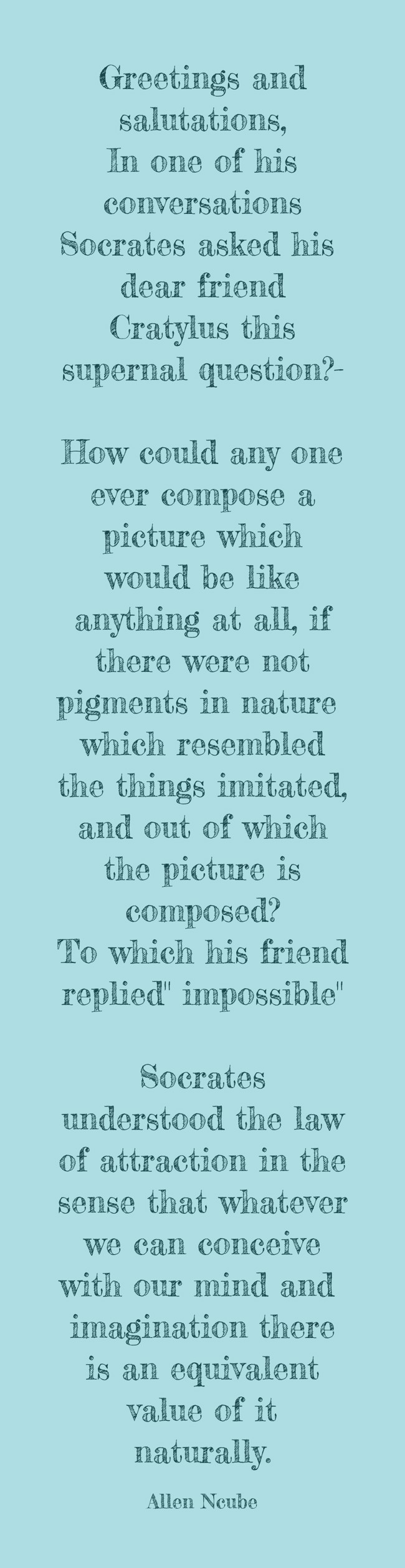 "Greetings and salutations, In one of his conversations Socrates asked his dear friend Cratylus this supernal question?- How could any one ever compose a picture which would be like anything at all, if there were not pigments in nature which resembled the things imitated, and out of which the picture is composed? To which his friend replied" impossible" Socrates understood the law of attraction in the sense that whatever we can conceive with our mind and imagination there is an equivalent value of it naturally."