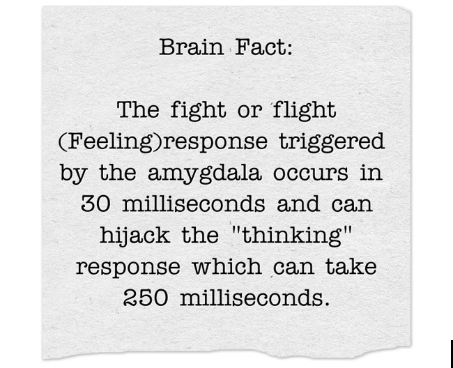 "Brain Fact: The fight or flight (Feeling)response triggered by the amygdala occurs in 30 milliseconds and can hijack the "thinking" response which can take 250 milliseconds."