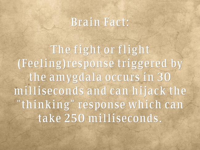 "Brain Fact: The fight or flight (Feeling)response triggered by the amygdala occurs in 30 milliseconds and can hijack the "thinking" response which can take 250 milliseconds."