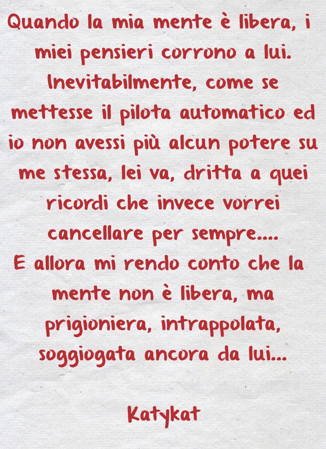 "Quando la mia mente è libera, i miei pensieri corrono a lui. Inevitabilmente, come se mettesse il pilota automatico ed io non avessi più alcun potere su me stessa, lei va, dritta a quei ricordi che invece vorrei cancellare per sempre.... E allora mi rendo conto che la mente non è libera, ma prigioniera, intrappolata, soggiogata ancora da lui... Katykat"