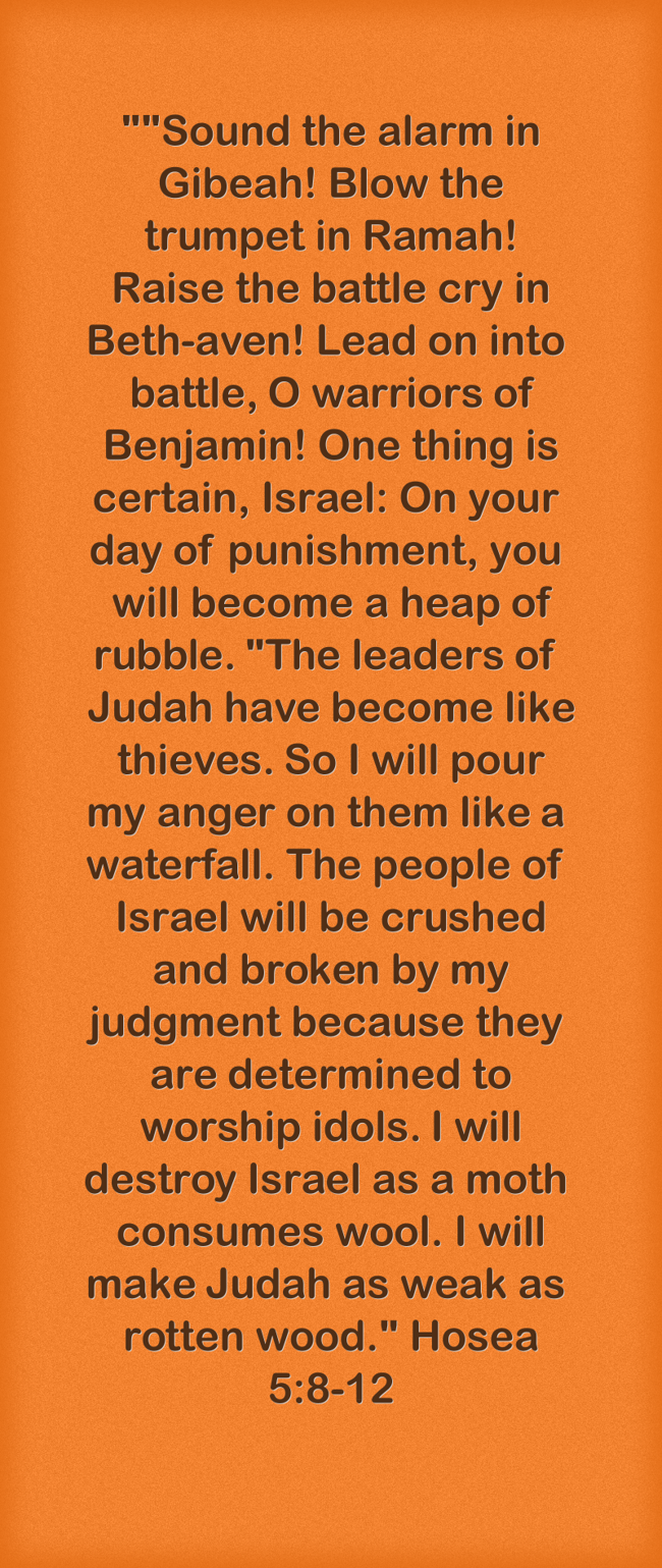 """Sound the alarm in Gibeah! Blow the trumpet in Ramah! Raise the battle cry in Beth-aven! Lead on into battle, O warriors of Benjamin! One thing is certain, Israel: On your day of punishment, you will become a heap of rubble. "The leaders of Judah have become like thieves. So I will pour my anger on them like a waterfall. The people of Israel will be crushed and broken by my judgment because they are determined to worship idols. I will destroy Israel as a moth consumes wool. I will make Judah as weak as rotten wood." Hosea 5:8-12 "