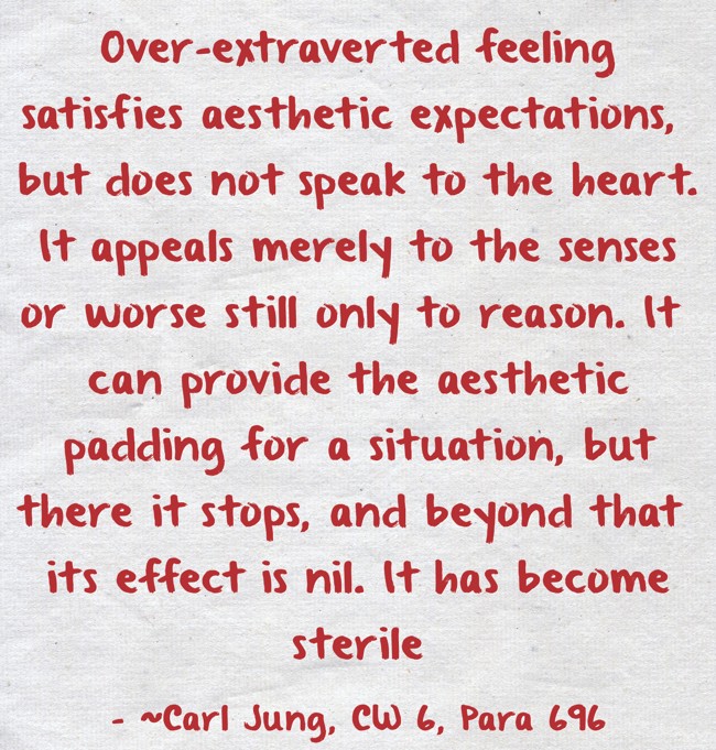 "Over-extraverted feeling satisfies aesthetic expectations, but does not speak to the heart. It appeals merely to the senses or worse still only to reason. It can provide the aesthetic padding for a situation, but there it stops, and beyond that its effect is nil. It has become sterile "