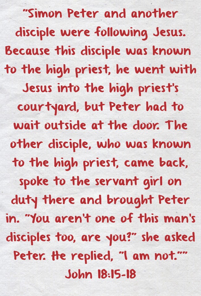 ""Simon Peter and another disciple were following Jesus. Because this disciple was known to the high priest, he went with Jesus into the high priest's courtyard, but Peter had to wait outside at the door. The other disciple, who was known to the high priest, came back, spoke to the servant girl on duty there and brought Peter in. "You aren't one of this man's disciples too, are you?" she asked Peter. He replied, "I am not."" John 18:15-18"