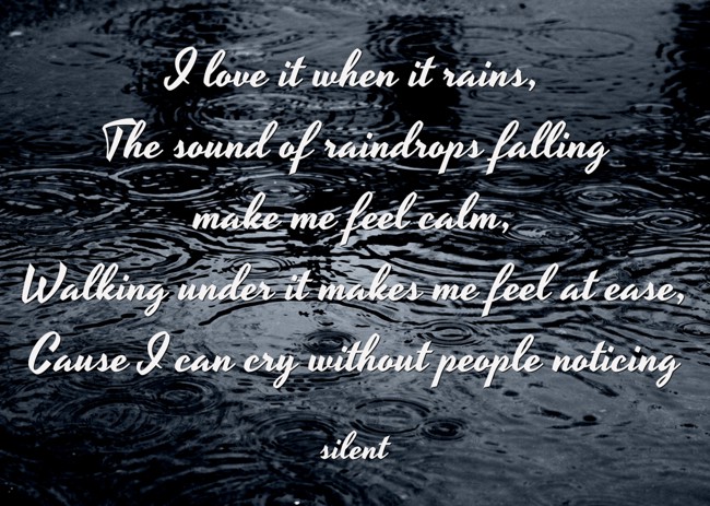 "I love it when it rains, The sound of raindrops falling make me feel calm, Walking under it makes me feel at ease, Cause I can cry without people noticing"