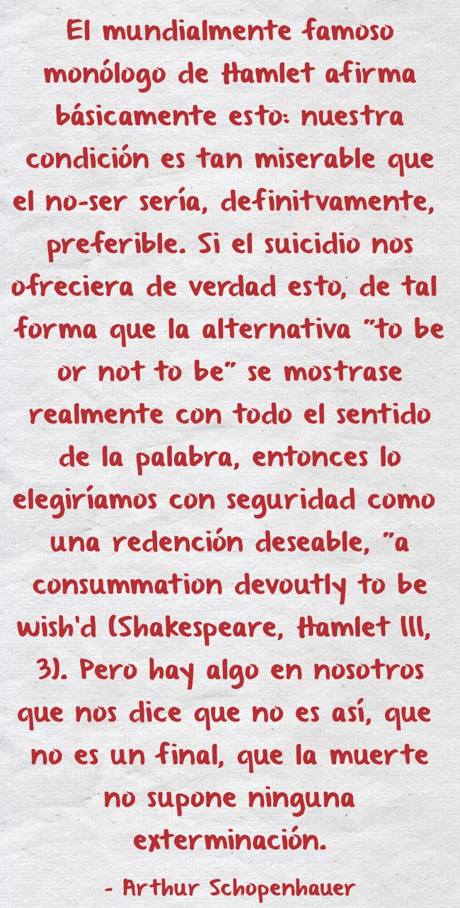 "El mundialmente famoso monólogo de Hamlet afirma básicamente esto: nuestra condición es tan miserable que el no-ser sería, definitvamente, preferible. Si el suicidio nos ofreciera de verdad esto, de tal forma que la alternativa "to be or not to be" se mostrase realmente con todo el sentido de la palabra, entonces lo elegiríamos con seguridad como una redención deseable, "a consummation devoutly to be wish'd (Shakespeare, Hamlet III, 3). Pero hay algo en nosotros que nos dice que no es así, que no es un final, que la muerte no supone ninguna exterminación."