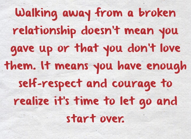 " Walking away from a broken relationship doesn't mean you gave up or that you don't love them. It means you have enough self-respect and courage to realize it's time to let go and start over. "