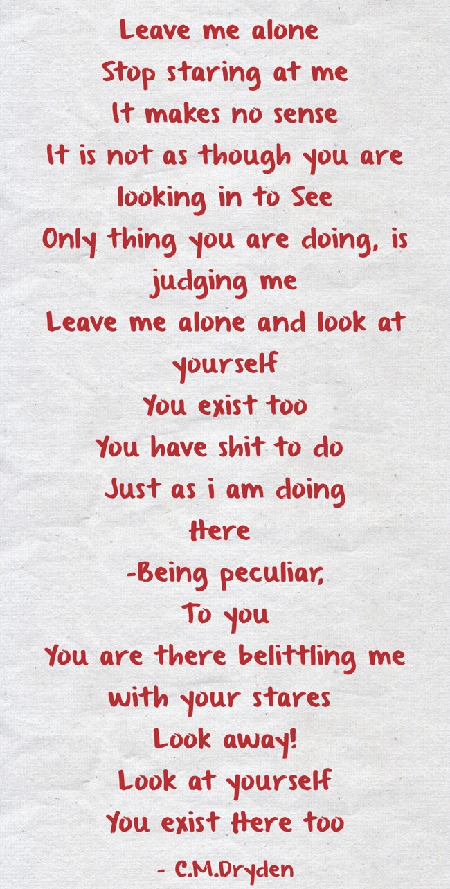"Leave me alone Stop staring at me It makes no sense It is not as though you are looking in to See Only thing you are doing, is judging me Leave me alone and look at yourself You exist too You have shit to do Just as i am doing Here -Being peculiar, To you You are there belittling me with your stares Look away! Look at yourself You exist Here too "