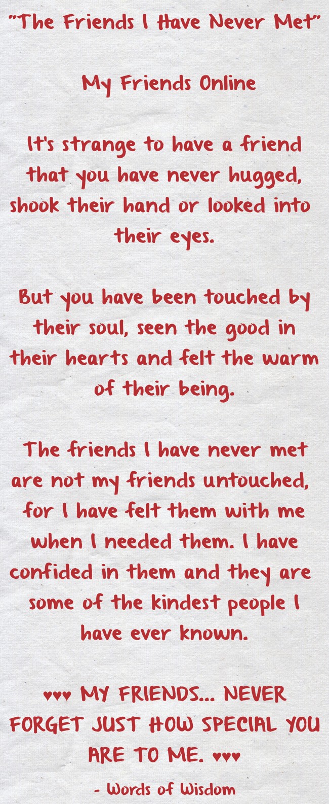 ""The Friends I Have Never Met" My Friends Online It's strange to have a friend that you have never hugged, shook their hand or looked into their eyes. But you have been touched by their soul, seen the good in their hearts and felt the warm of their being. The friends I have never met are not my friends untouched, for I have felt them with me when I needed them. I have confided in them and they are some of the kindest people I have ever known. ♥♥♥ MY FRIENDS... NEVER FORGET JUST HOW SPECIAL YOU ARE TO ME. ♥♥♥"