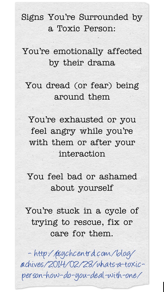 "Signs You’re Surrounded by a Toxic Person: You’re emotionally affected by their drama You dread (or fear) being around them You’re exhausted or you feel angry while you’re with them or after your interaction You feel bad or ashamed about yourself You’re stuck in a cycle of trying to rescue, fix or care for them."