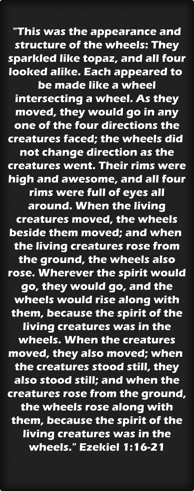 ""This was the appearance and structure of the wheels: They sparkled like topaz, and all four looked alike. Each appeared to be made like a wheel intersecting a wheel. As they moved, they would go in any one of the four directions the creatures faced; the wheels did not change direction as the creatures went. Their rims were high and awesome, and all four rims were full of eyes all around. When the living creatures moved, the wheels beside them moved; and when the living creatures rose from the ground, the wheels also rose. Wherever the spirit would go, they would go, and the wheels would rise along with them, because the spirit of the living creatures was in the wheels. When the creatures moved, they also moved; when the creatures stood still, they also stood still; and when the creatures rose from the ground, the wheels rose along with them, because the spirit of the living creatures was in the wheels." Ezekiel 1:16-21 "