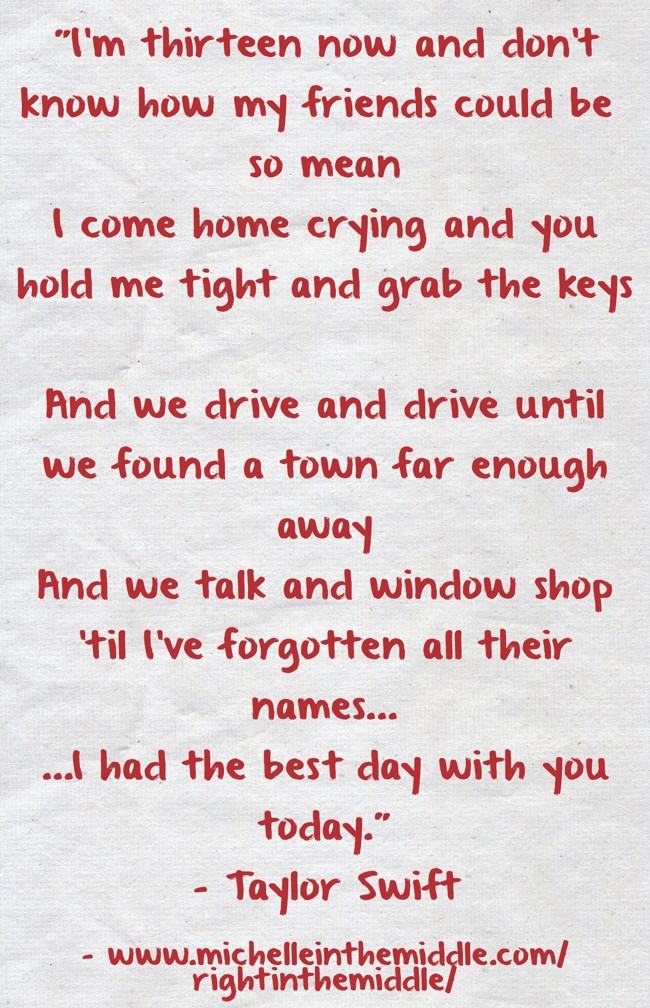 ""I'm thirteen now and don't know how my friends could be so mean I come home crying and you hold me tight and grab the keys And we drive and drive until we found a town far enough away And we talk and window shop 'til I've forgotten all their names... ...I had the best day with you today." - Taylor Swift"