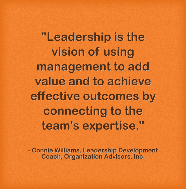 ""Leadership is the vision of using management to add value and to achieve effective outcomes by connecting to the team's expertise.""