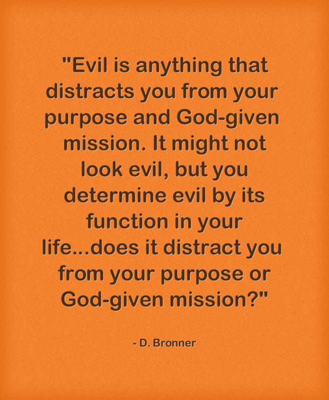 ""Evil is anything that distracts you from your purpose and God-given mission. It might not look evil, but you determine evil by its function in your life...does it distract you from your purpose or God-given mission?""