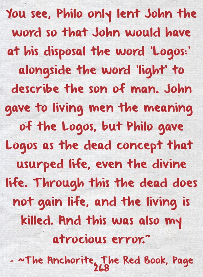 " You see, Philo only lent John the word so that John would have at his disposal the word 'Logos:' alongside the word 'light' to describe the son of man. John gave to living men the meaning of the Logos, but Philo gave Logos as the dead concept that usurped life, even the divine life. Through this the dead does not gain life, and the living is killed. And this was also my atrocious error." "