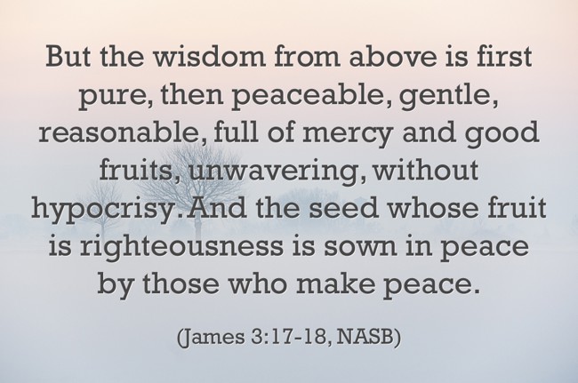 "But the wisdom from above is first pure, then peaceable, gentle, reasonable, full of mercy and good fruits, unwavering, without hypocrisy. And the seed whose fruit is righteousness is sown in peace by those who make peace."