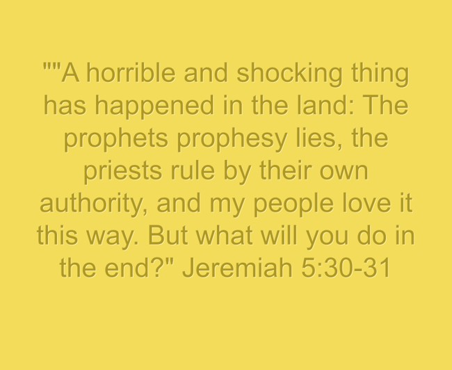"""A horrible and shocking thing has happened in the land: The prophets prophesy lies, the priests rule by their own authority, and my people love it this way. But what will you do in the end?" Jeremiah 5:30-31"