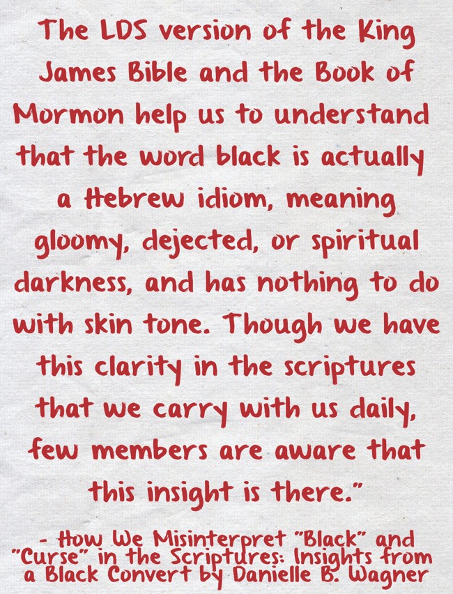 "The LDS version of the King James Bible and the Book of Mormon help us to understand that the word black is actually a Hebrew idiom, meaning gloomy, dejected, or spiritual darkness, and has nothing to do with skin tone. Though we have this clarity in the scriptures that we carry with us daily, few members are aware that this insight is there.”"