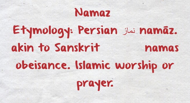 "Namaz Etymology: Persian نماز namāz. akin to Sanskrit नमस् namas obeisance. Islamic worship or prayer."