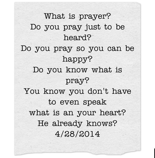 "What is prayer? Do you pray just to be heard? Do you pray so you can be happy? Do you know what is pray? You know you don't have to even speak what is an your heart? He already knows? 4/28/2014"