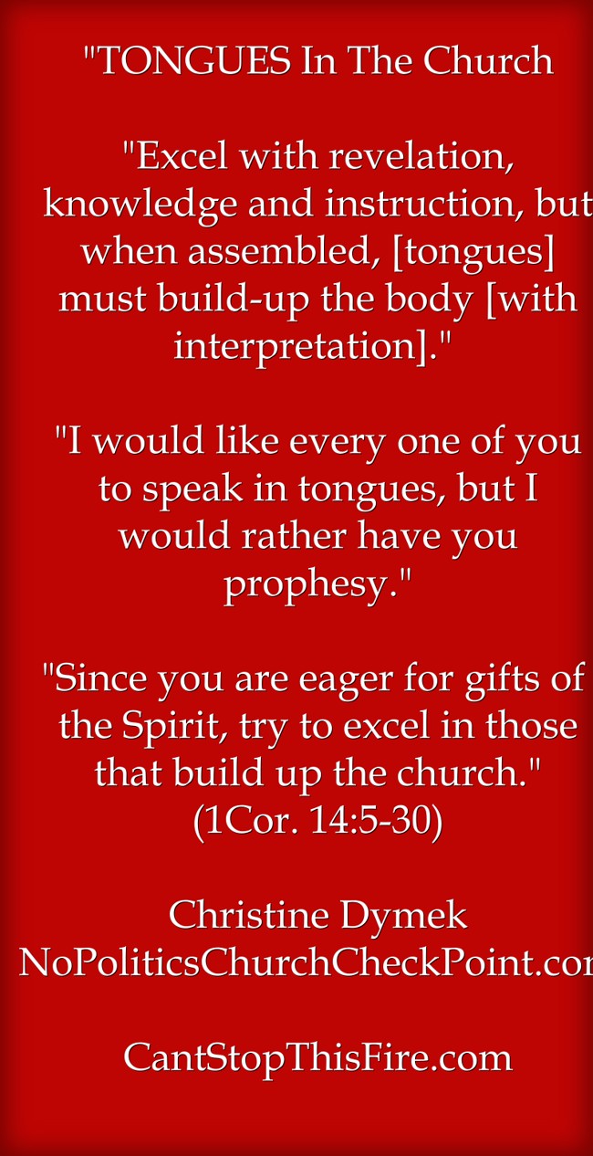 ""TONGUES In The Church "Excel with revelation, knowledge and instruction, but when assembled, [tongues] must build-up the body [with interpretation]." "I would like every one of you to speak in tongues, but I would rather have you prophesy." "Since you are eager for gifts of the Spirit, try to excel in those that build up the church." (1Cor. 14:5-30) Christine Dymek NoPoliticsChurchCheckPoint.com CantStopThisFire.com"
