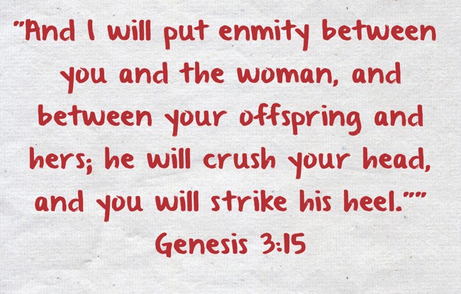 ""And I will put enmity between you and the woman, and between your offspring and hers; he will crush your head, and you will strike his heel."" Genesis 3:15"