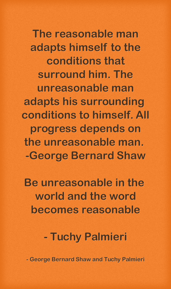 "The reasonable man adapts himself to the conditions that surround him. The unreasonable man adapts his surrounding conditions to himself. All progress depends on the unreasonable man. -George Bernard Shaw Be unreasonable in the world and the word becomes reasonable - Tuchy Palmieri"