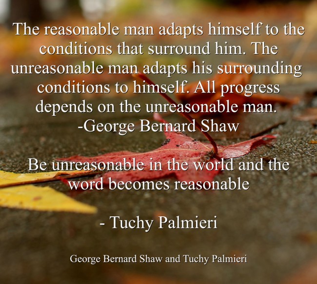 "The reasonable man adapts himself to the conditions that surround him. The unreasonable man adapts his surrounding conditions to himself. All progress depends on the unreasonable man. -George Bernard Shaw Be unreasonable in the world and the word becomes reasonable - Tuchy Palmieri"
