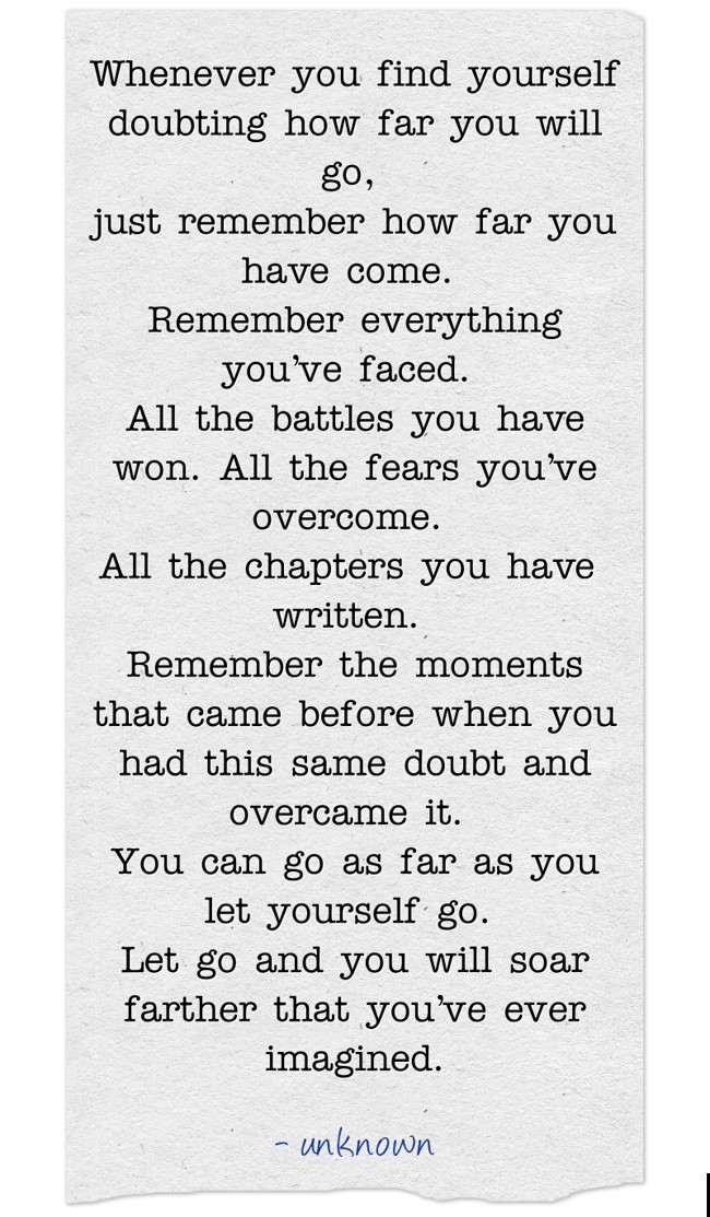 "Whenever you find yourself doubting how far you will go, just remember how far you have come. Remember everything you’ve faced. All the battles you have won. All the fears you’ve overcome. All the chapters you have written. Remember the moments that came before when you had this same doubt and overcame it. You can go as far as you let yourself go. Let go and you will soar farther that you’ve ever imagined."