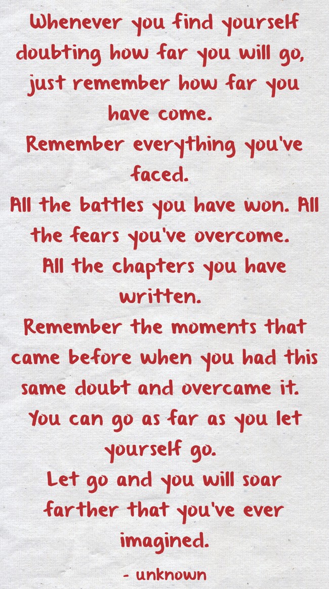 "Whenever you find yourself doubting how far you will go, just remember how far you have come. Remember everything you’ve faced. All the battles you have won. All the fears you’ve overcome. All the chapters you have written. Remember the moments that came before when you had this same doubt and overcame it. You can go as far as you let yourself go. Let go and you will soar farther that you’ve ever imagined."