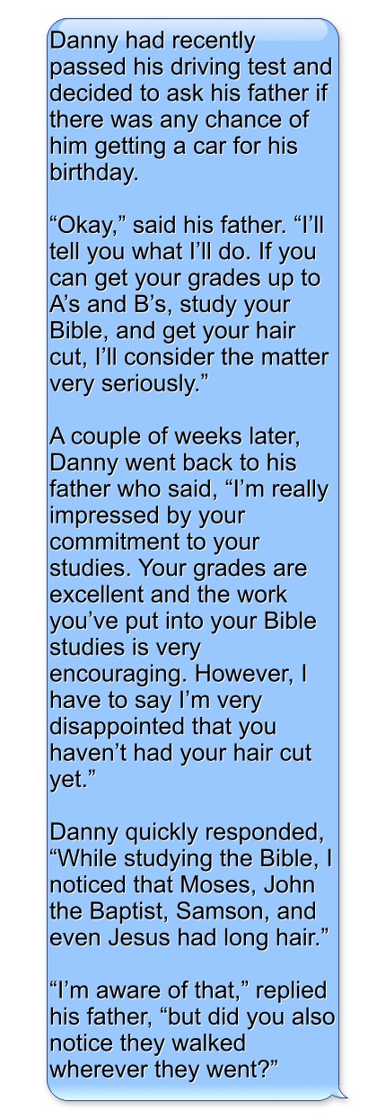 "Danny had recently passed his driving test and decided to ask his father if there was any chance of him getting a car for his birthday. “Okay,” said his father. “I’ll tell you what I’ll do. If you can get your grades up to A’s and B’s, study your Bible, and get your hair cut, I’ll consider the matter very seriously.” A couple of weeks later, Danny went back to his father who said, “I’m really impressed by your commitment to your studies. Your grades are excellent and the work you’ve put into your Bible studies is very encouraging. However, I have to say I’m very disappointed that you haven’t had your hair cut yet.” Danny quickly responded, “While studying the Bible, I noticed that Moses, John the Baptist, Samson, and even Jesus had long hair.” “I’m aware of that,” replied his father, “but did you also notice they walked wherever they went?”"