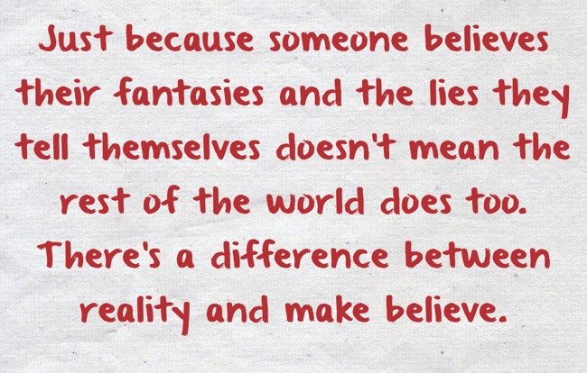 "Just because someone believes their fantasies and the lies they tell themselves doesn't mean the rest of the world does too. There's a difference between reality and make believe."